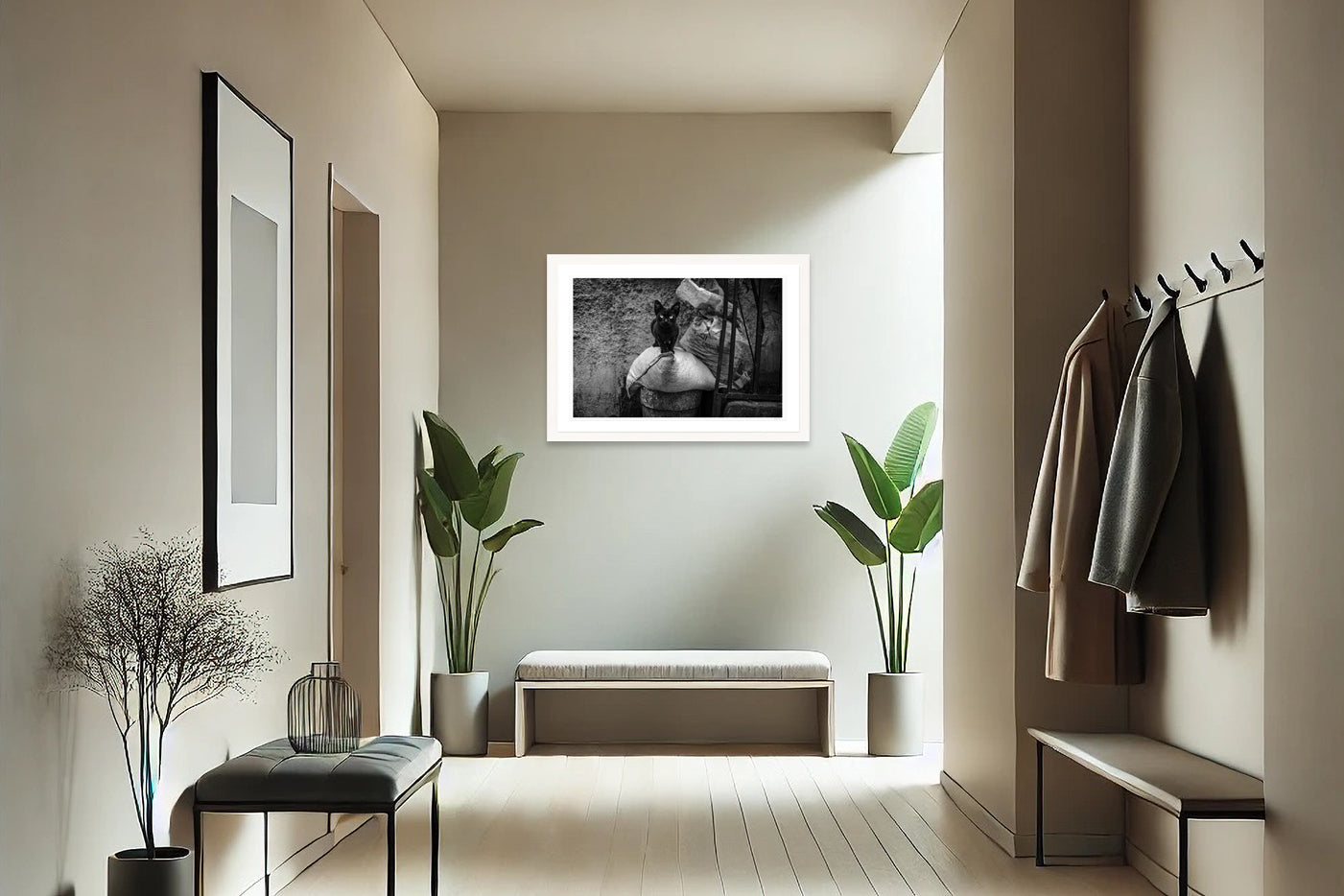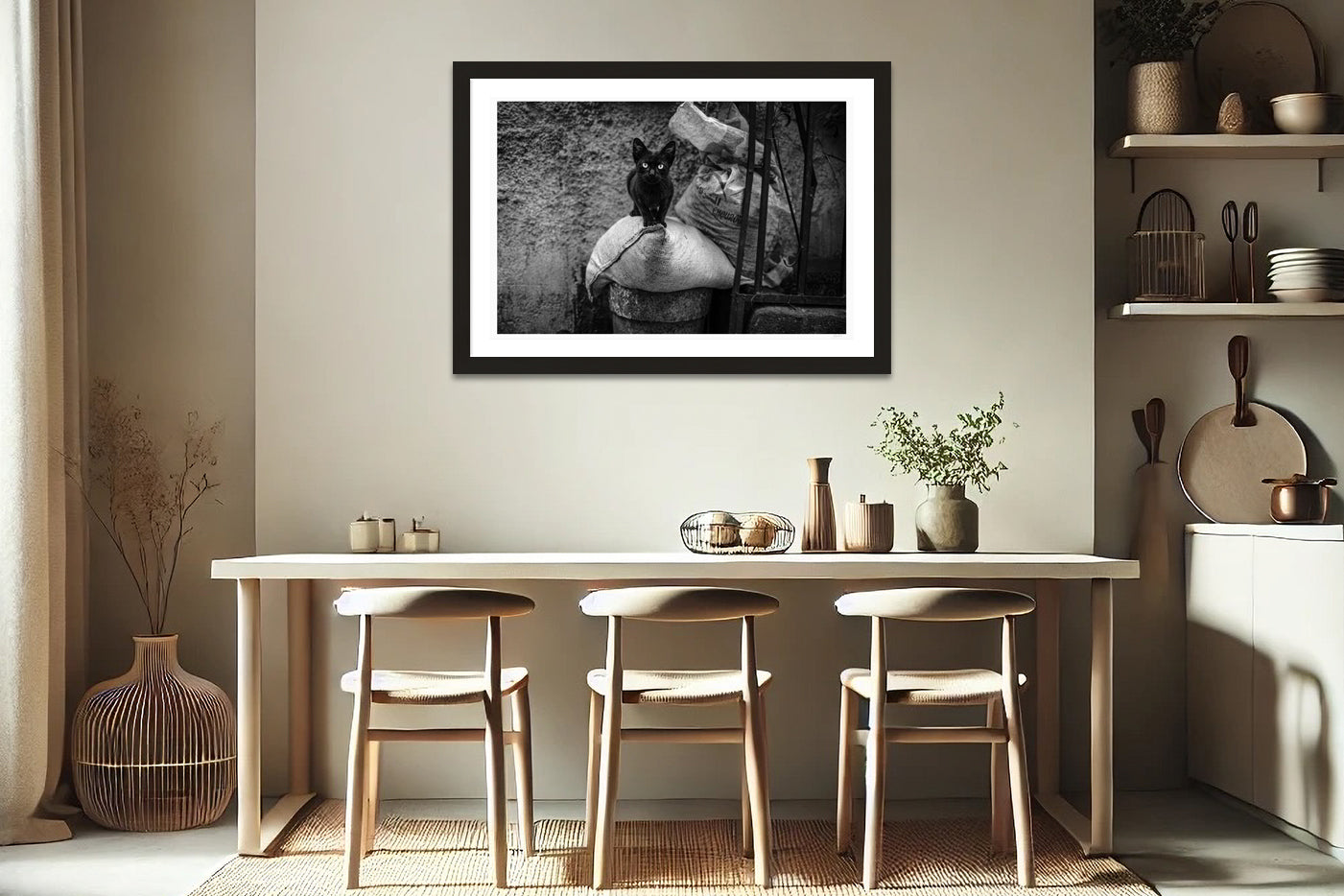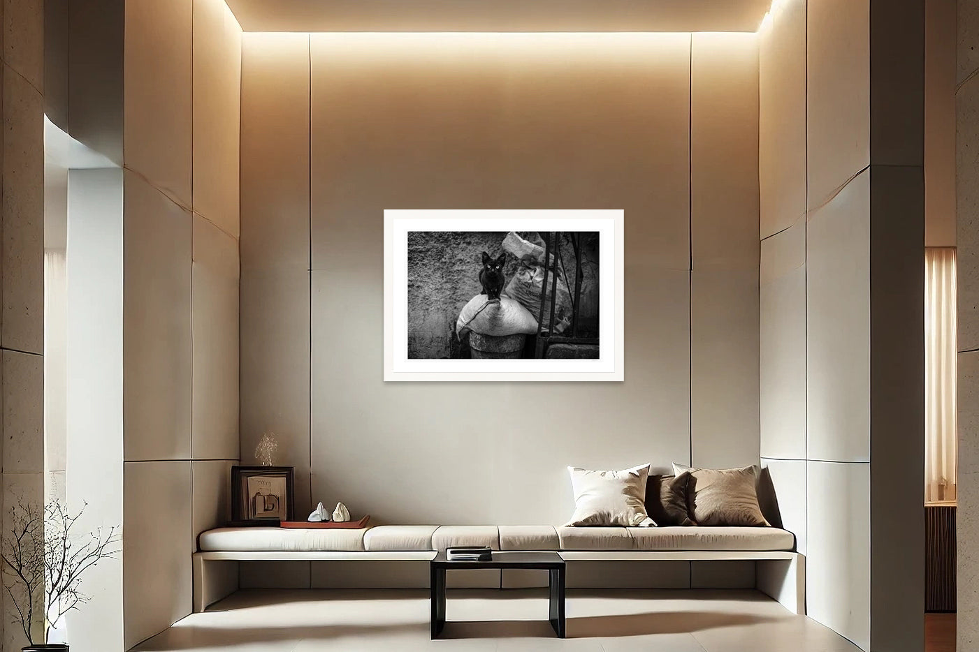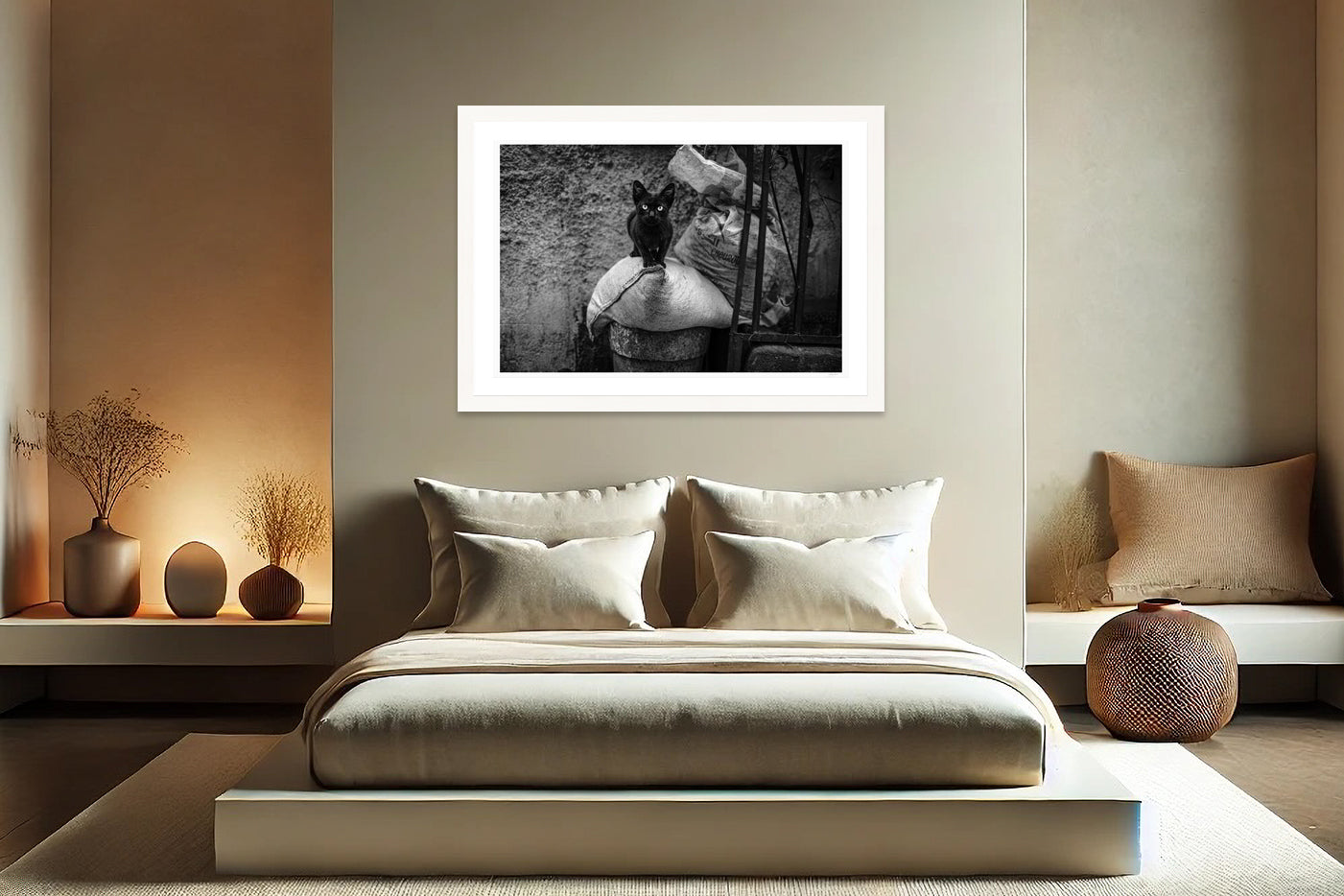 Eyes of the Medina captures the raw spirit of Morocco through the piercing gaze of a street cat, perched atop a sack amongst the textured walls of the old city. The stark black-and-white composition highlights the contrast between the cat’s luminous eyes and the gritty urban backdrop, creating an image that feels both intimate and cinematic.