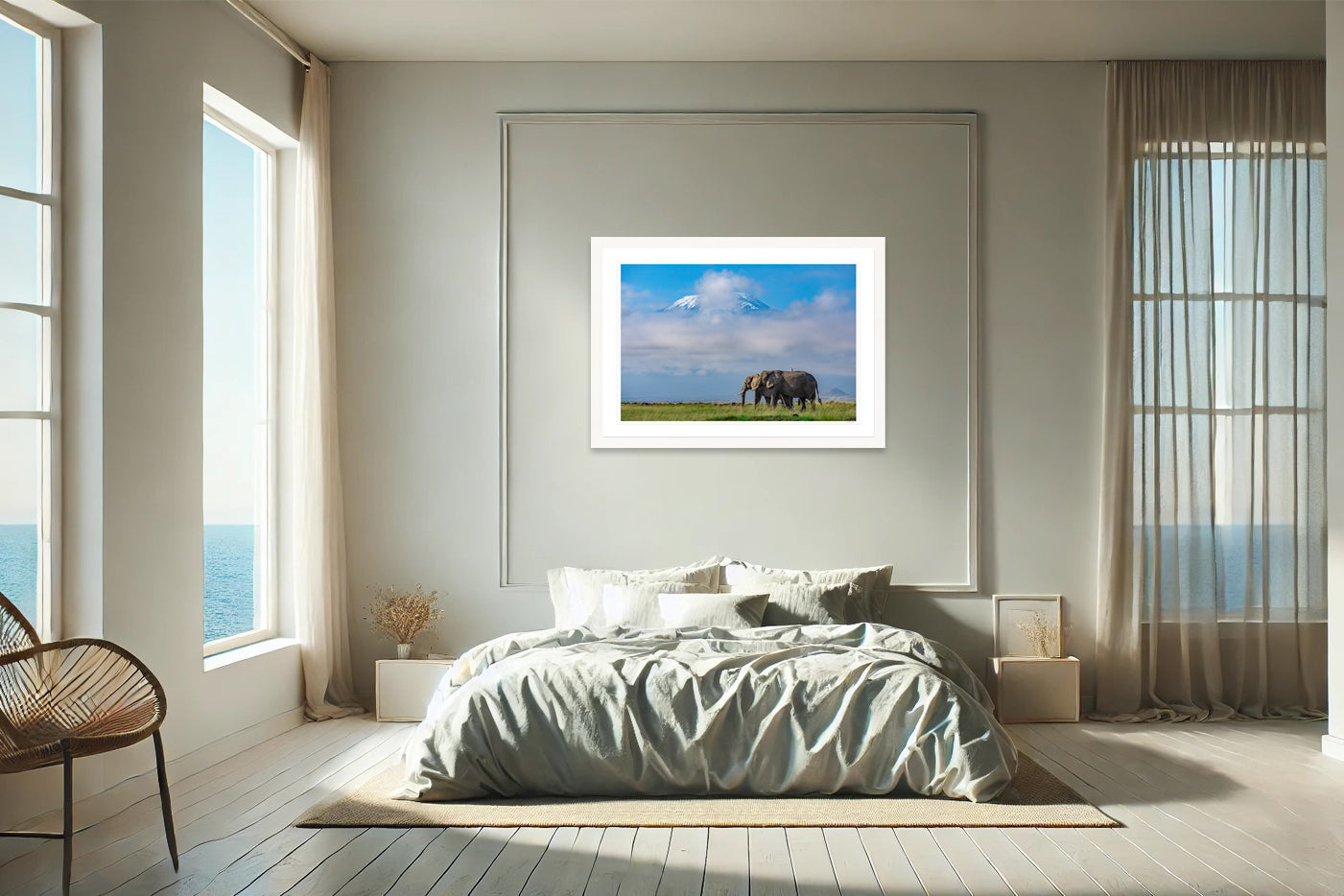 Giants of Kilimanjaro captures a pair of elephants making their way across the open plains of Amboseli National Park, framed by the snow-capped peak of Mount Kilimanjaro rising through the clouds. This fine art wildlife photograph of Giants of Kilimanjaro celebrates the harmony between Africa’s largest land animals and one of its most iconic landscapes, uniting two important symbols of the region in a single frame.