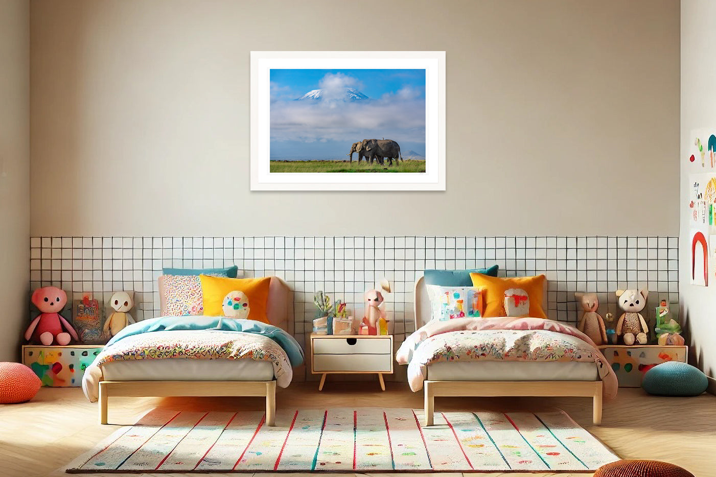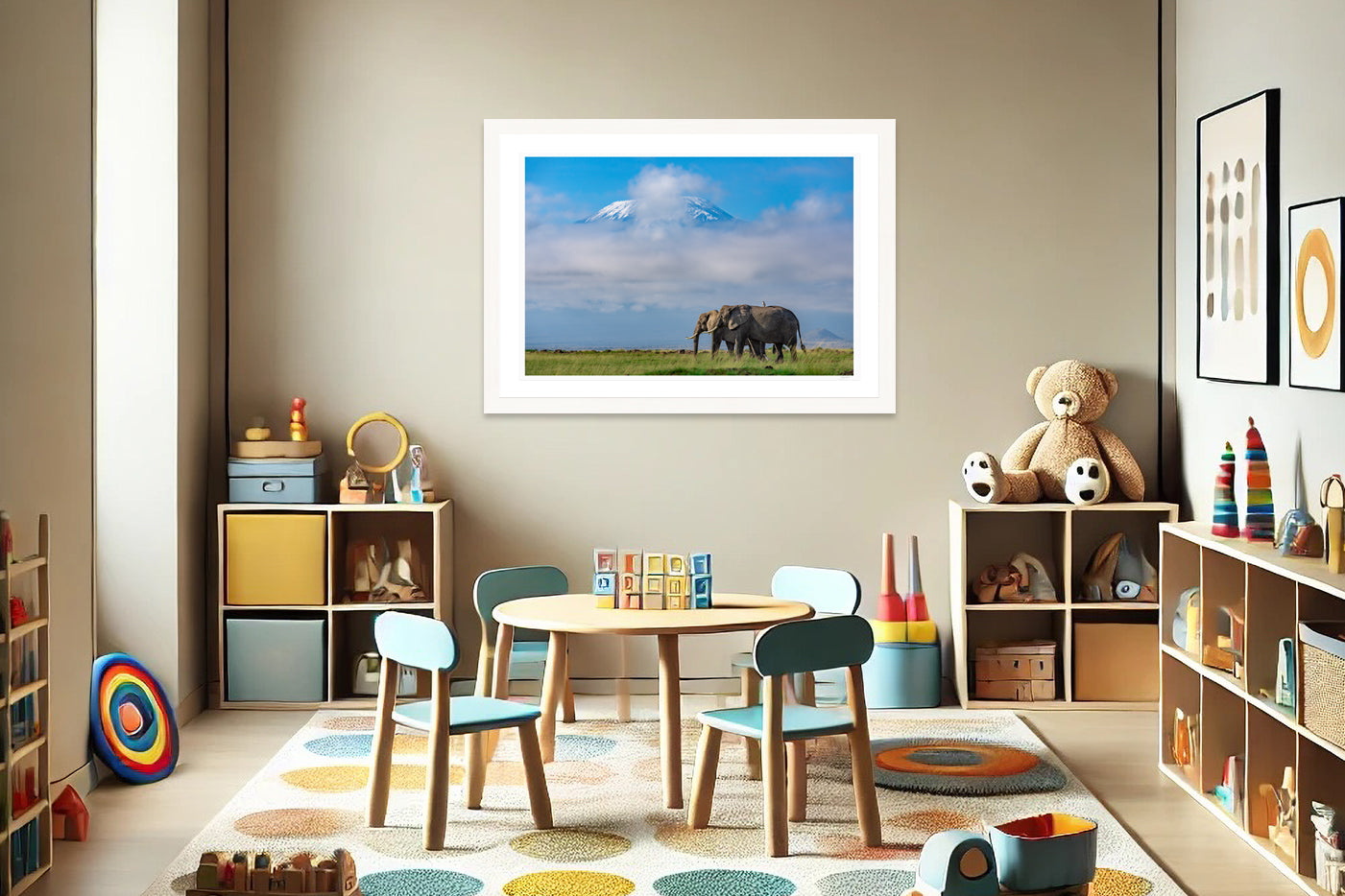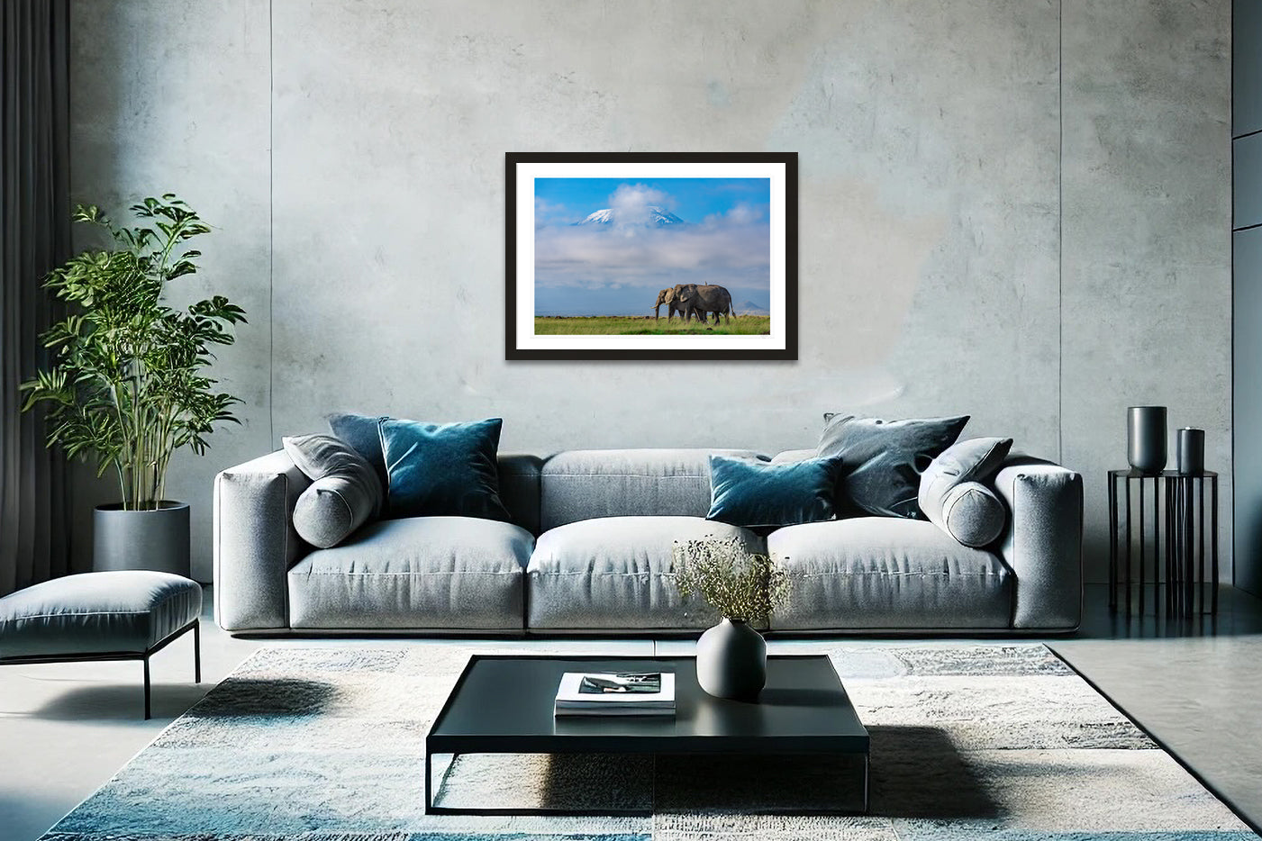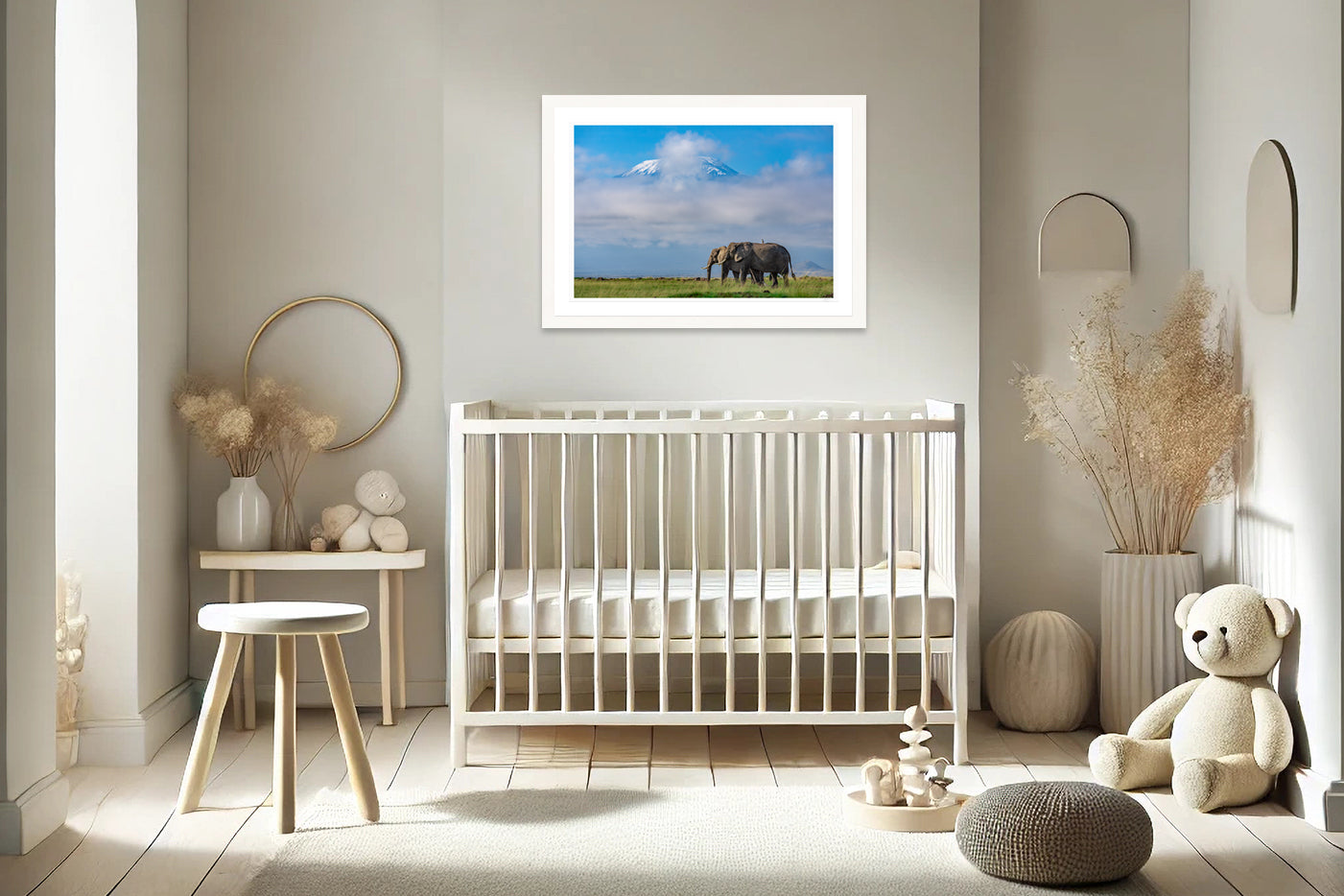 The lush green grass contrasts with the cool blues and whites of the distant mountain, while soft clouds drift across the scene, adding depth and atmosphere. This piece speaks to the timeless rhythm of the wild and the importance of preserving the spaces where such moments can unfold. Perfect for nature lovers or anyone inspired by Africa’s beauty, Giants of Kilimanjaro brings the majesty of Amboseli into your home.