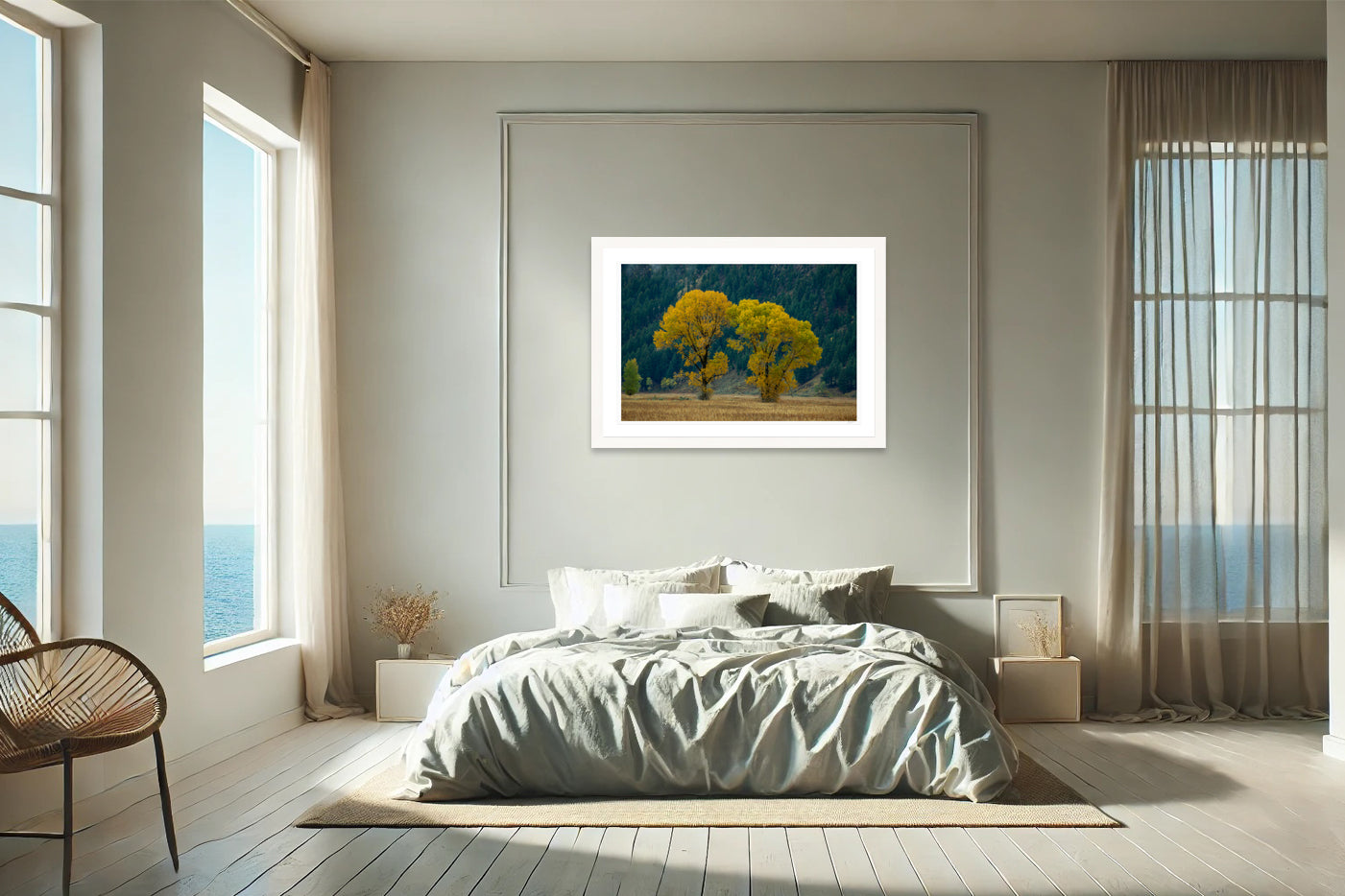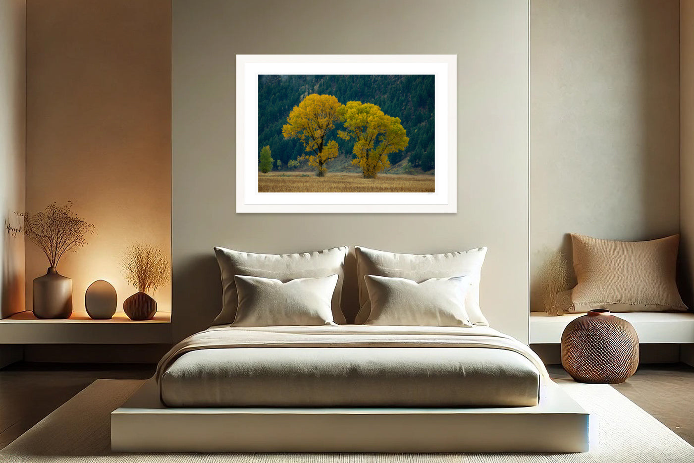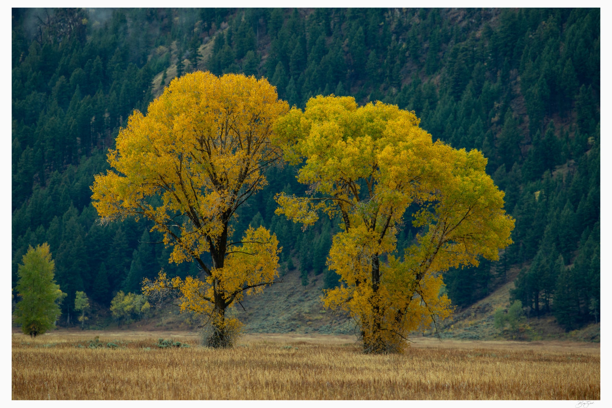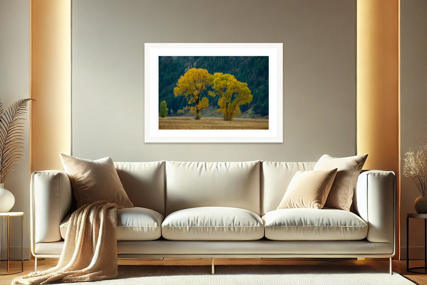 Gold In The Valley captures the beauty of autumn in the American West, where two stately cottonwood trees stand side by side in a quiet mountain valley. Their golden leaves blaze against the deep green backdrop of a forested mountainside, creating a striking contrast that celebrates the vivid colors of fall. The warm tones of the foliage, set against the cool, shadowed slopes, evoke the fleeting magic of the season and the timeless beauty of western landscapes. Every detail in this fine art photograph tells a story of resilience, change and the harmony of nature’s cycles. The composition draws the viewer into a place of stillness, where the air feels crisp and the light glows with the richness unique to autumn.