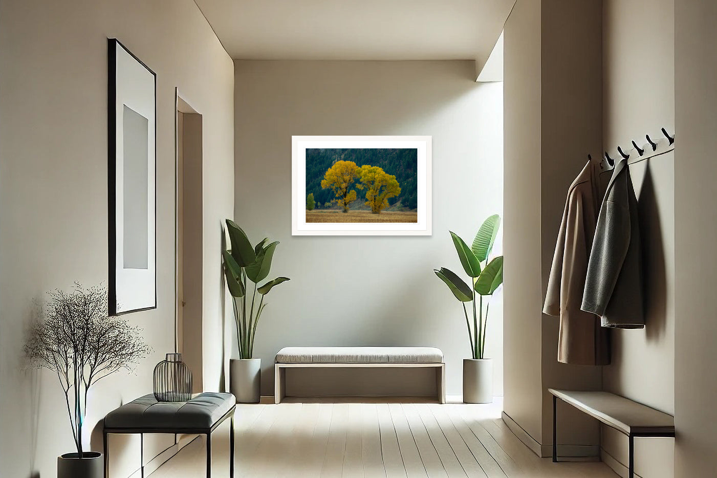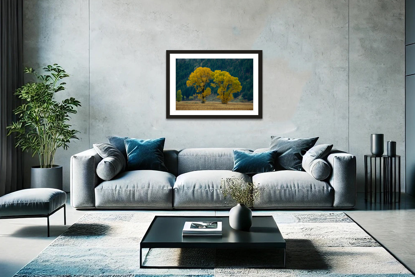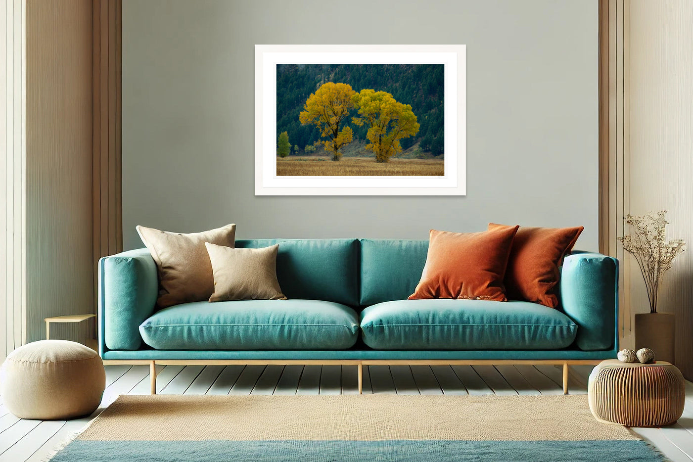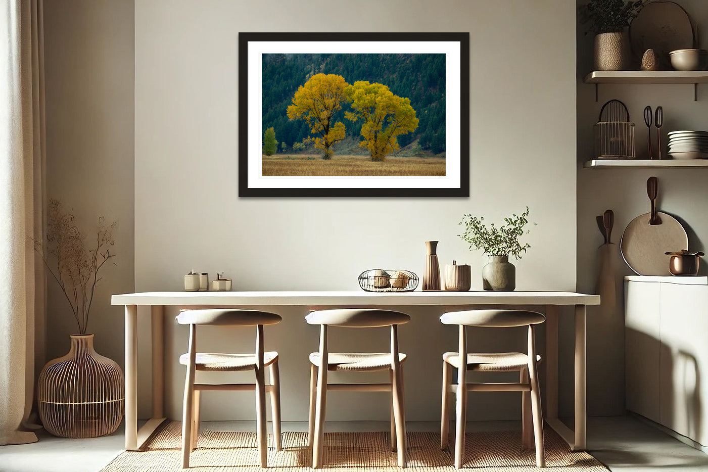 Gold In The Valley captures the beauty of autumn in the American West, where two stately cottonwood trees stand side by side in a quiet mountain valley. Their golden leaves blaze against the deep green backdrop of a forested mountainside, creating a striking contrast that celebrates the vivid colors of fall. The warm tones of the foliage, set against the cool, shadowed slopes, evoke the fleeting magic of the season and the timeless beauty of western landscapes. Every detail in this fine art photograph tells a story of resilience, change and the harmony of nature’s cycles. The composition draws the viewer into a place of stillness, where the air feels crisp and the light glows with the richness unique to autumn.