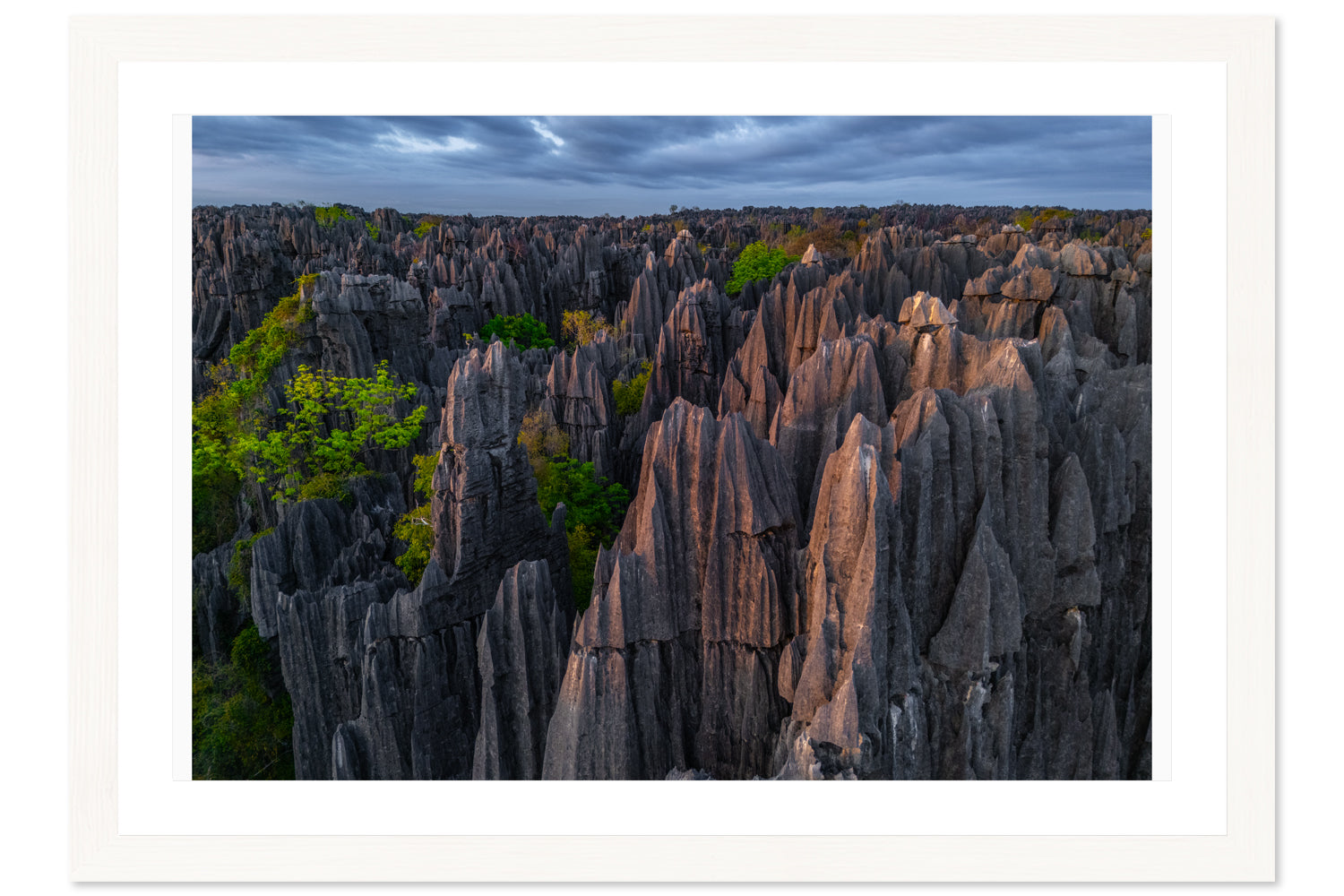 Guardians of the Tsingy captures the dramatic splendor of Madagascar’s towering limestone formations, where jagged stones rise abruptly from the Earth. Under the shifting light, each ridge and crevice reveals intricate textures shaped over millennia. Pockets of green foliage cling to the rugged rock, a reminder of life’s ability to flourish even in the most formidable terrain.