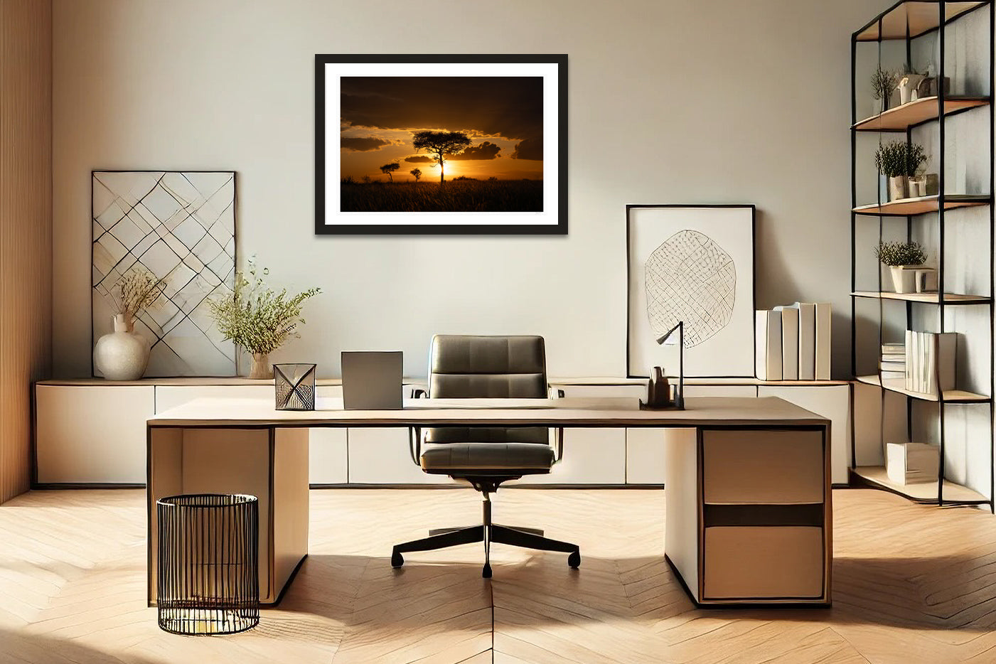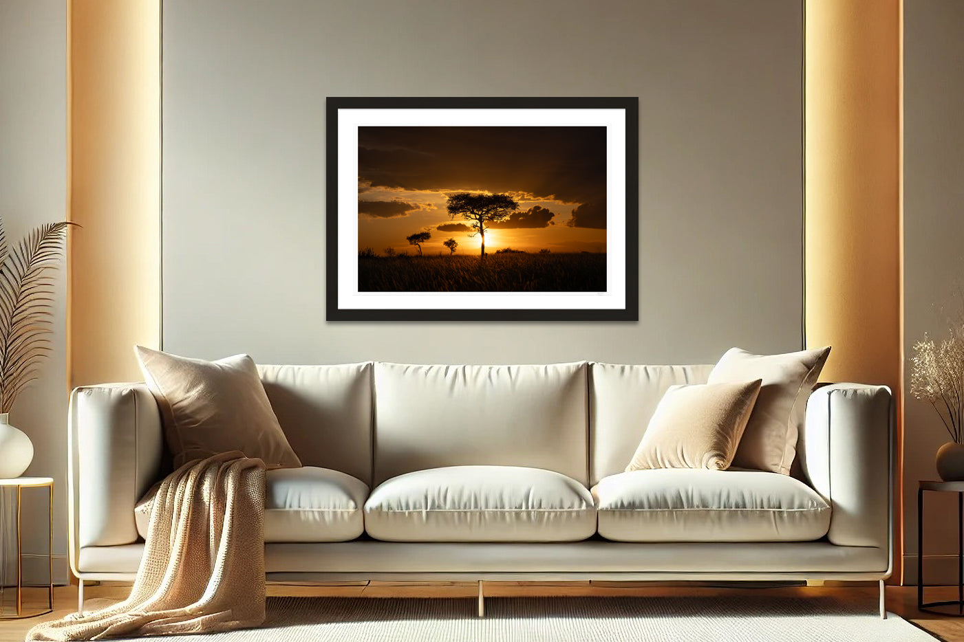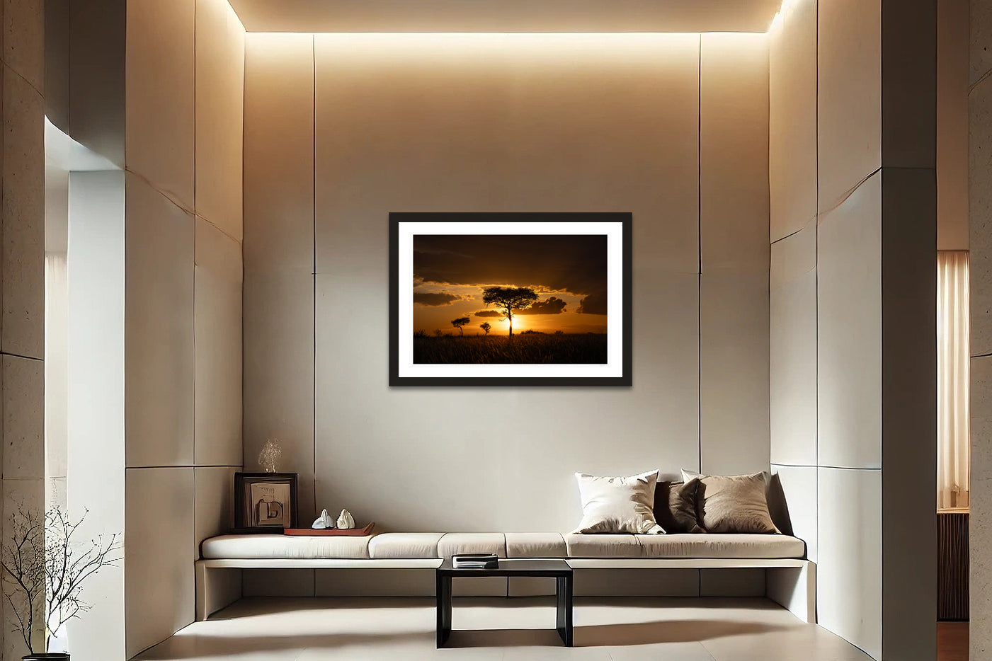 The composition draws the eye to the central acacia, perfectly backlit so that every branch stands out in sharp detail against the luminous sky. Part of the Nature’s Canvas collection, this piece evokes the timeless rhythm of the African wilderness, where each day ends in a spectacle of color and light.