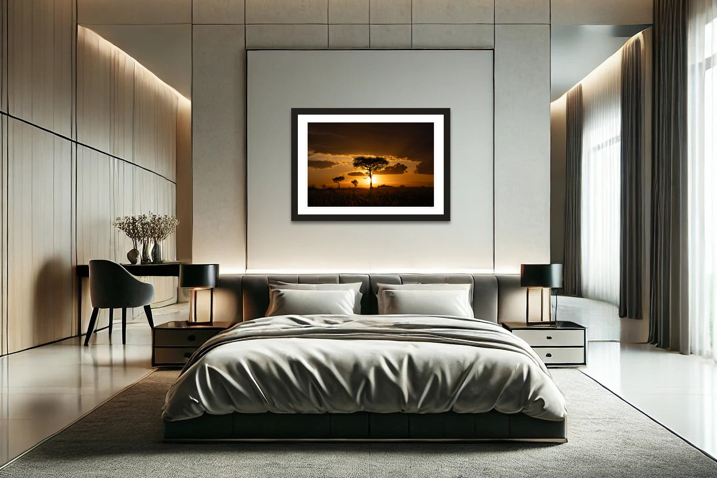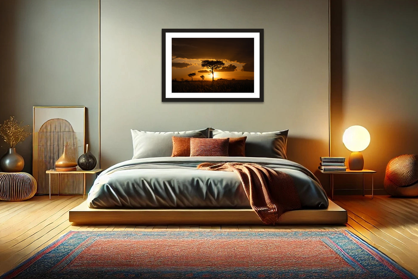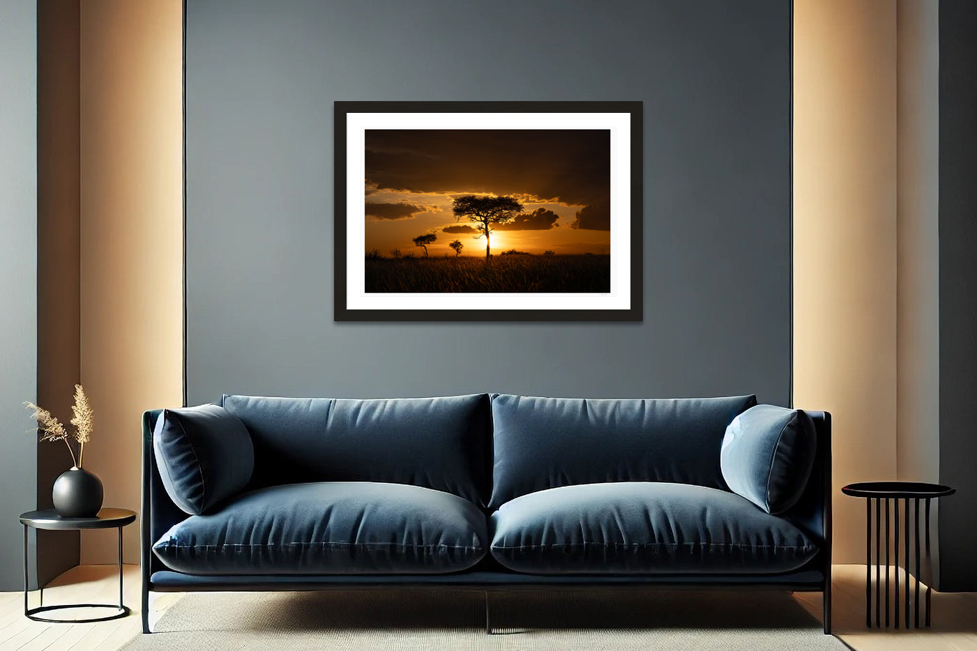 The composition draws the eye to the central acacia, perfectly backlit so that every branch stands out in sharp detail against the luminous sky. Part of the Nature’s Canvas collection, this piece evokes the timeless rhythm of the African wilderness, where each day ends in a spectacle of color and light.