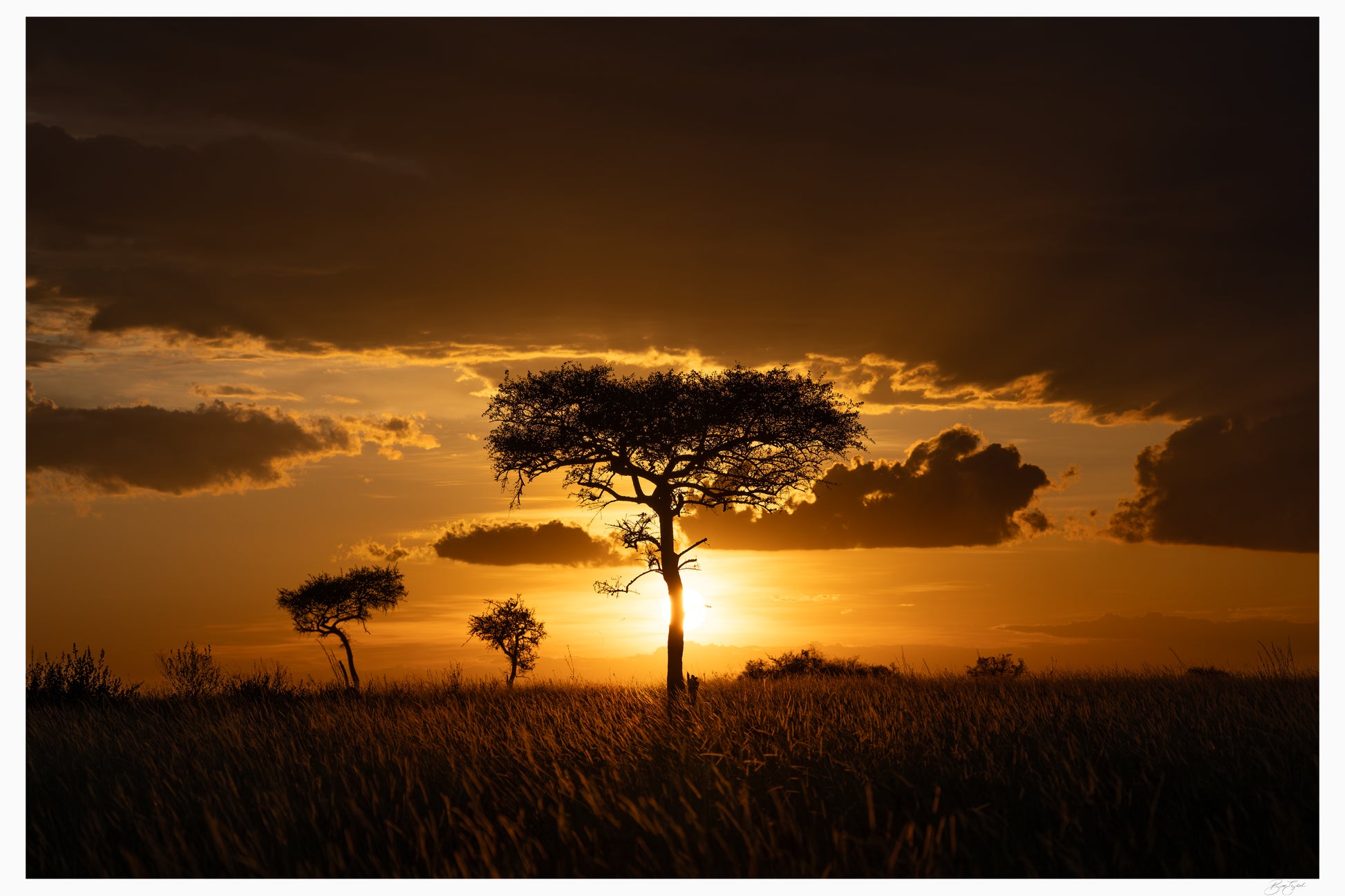 Savanna Gold captures the breathtaking beauty of sunset over the grasslands of Tanzania, where the warm glow of the setting sun silhouettes the iconic acacia trees. This fine art landscape photograph reveals a sky painted in rich amber and gold, with dramatic clouds framing the horizon and tall grasses swaying gently in the fading light.