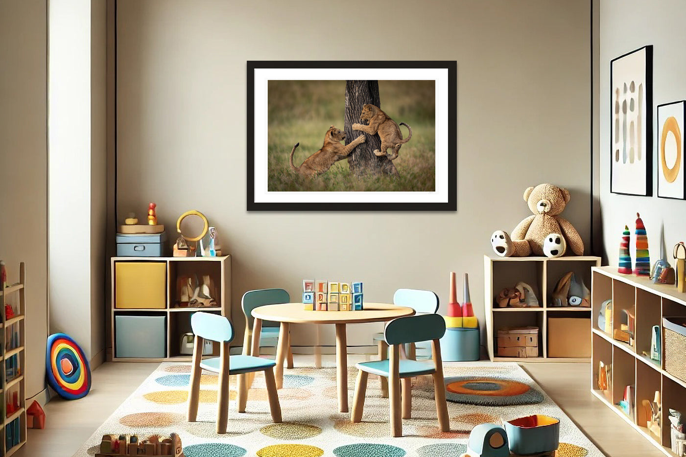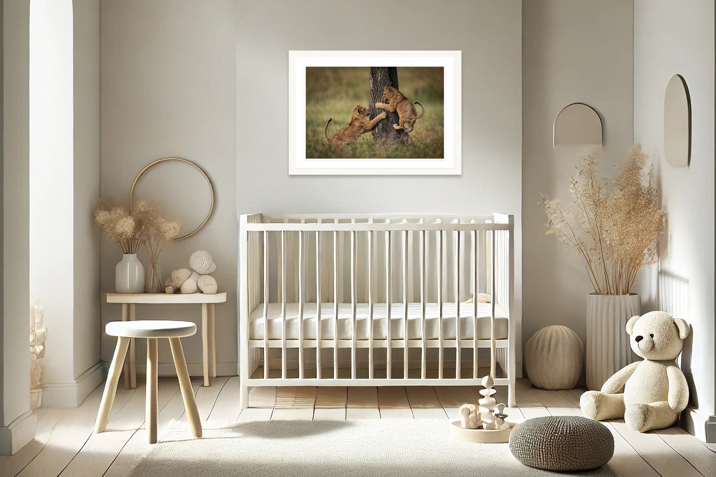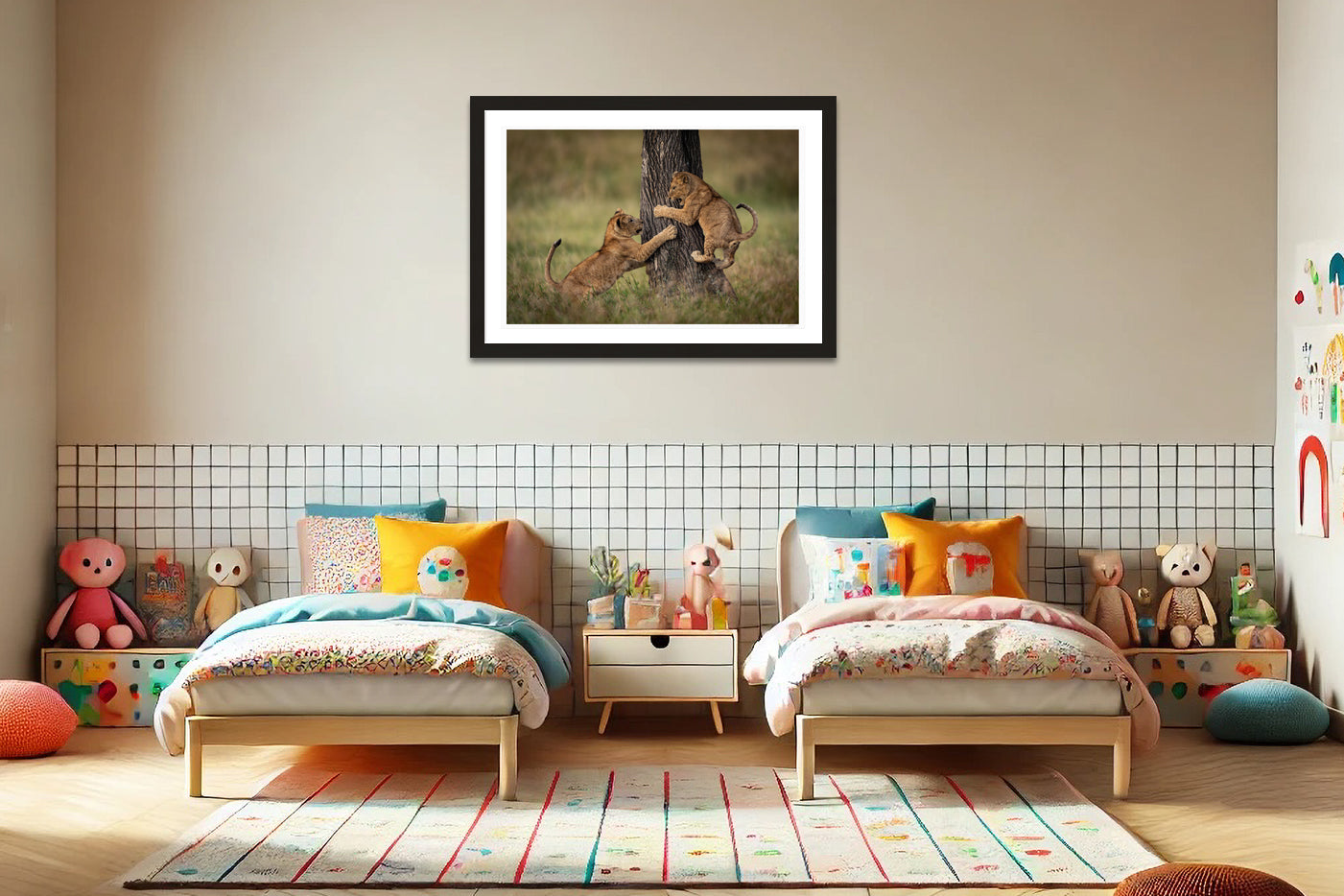 Treehouse Tumbles captures two young lion cubs mid-play, one scrambling up the trunk while the other leaps to join in the fun. This fun image, taken in Tanzania, celebrates the boundless energy, curiosity and mischief of the savanna’s youngest residents. Their playful antics, oversized paws and flick of their tails, adds to the joy of the moment. This piece brings the wonder of the animal kingdom to life in a way that delights all ages.