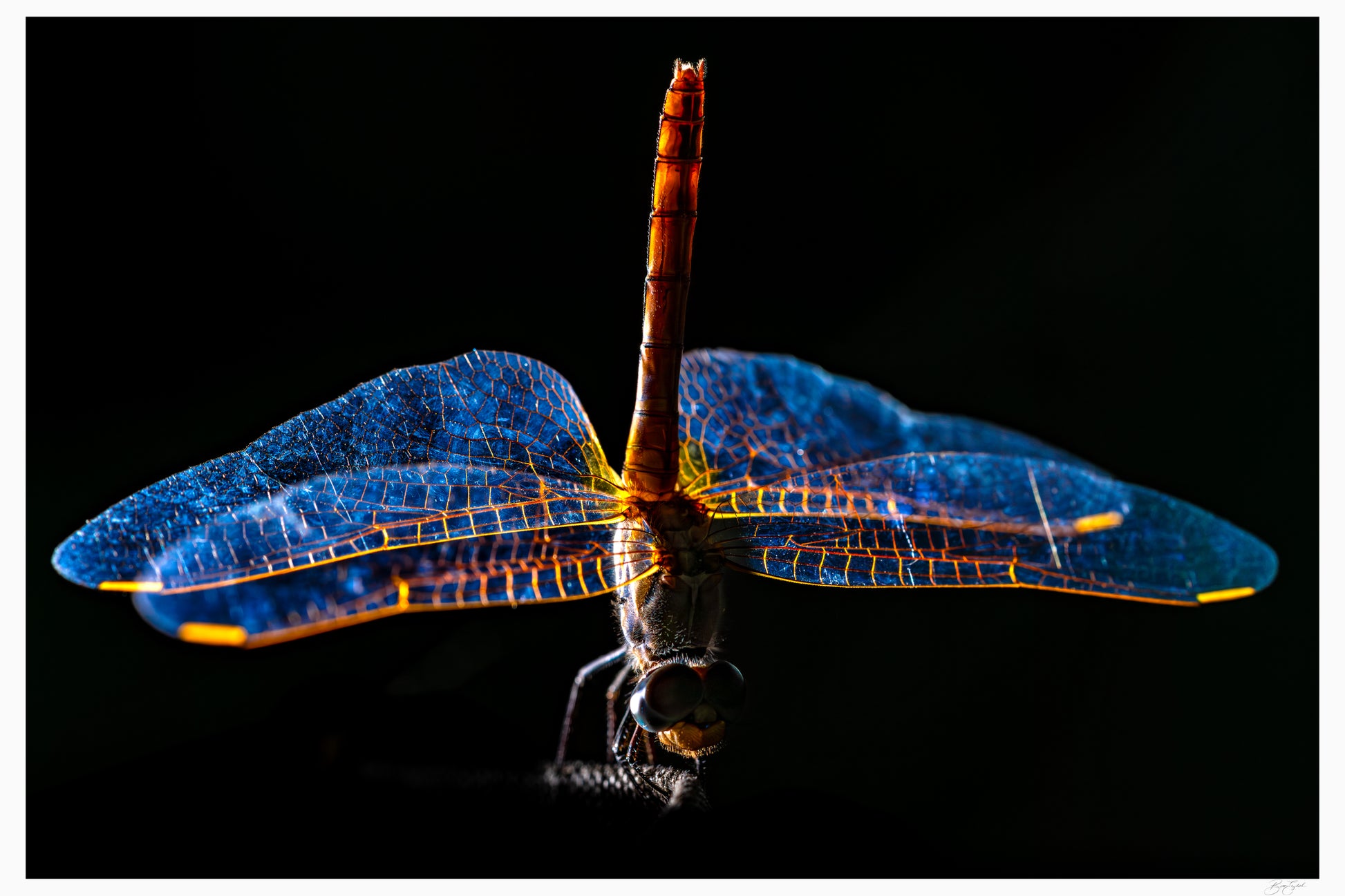 Wings of Light captures the exquisite geometry and iridescence of a dragonfly in striking detail. Illuminated against a dark backdrop, its wings glow in shades of electric blue with fiery orange veins, revealing the intricate structure that allows this delicate creature to dance effortlessly through the air. The sharp contrast between the luminous wings and the deep black background emphasizes both fragility and strength, creating an image that feels almost otherworldly.